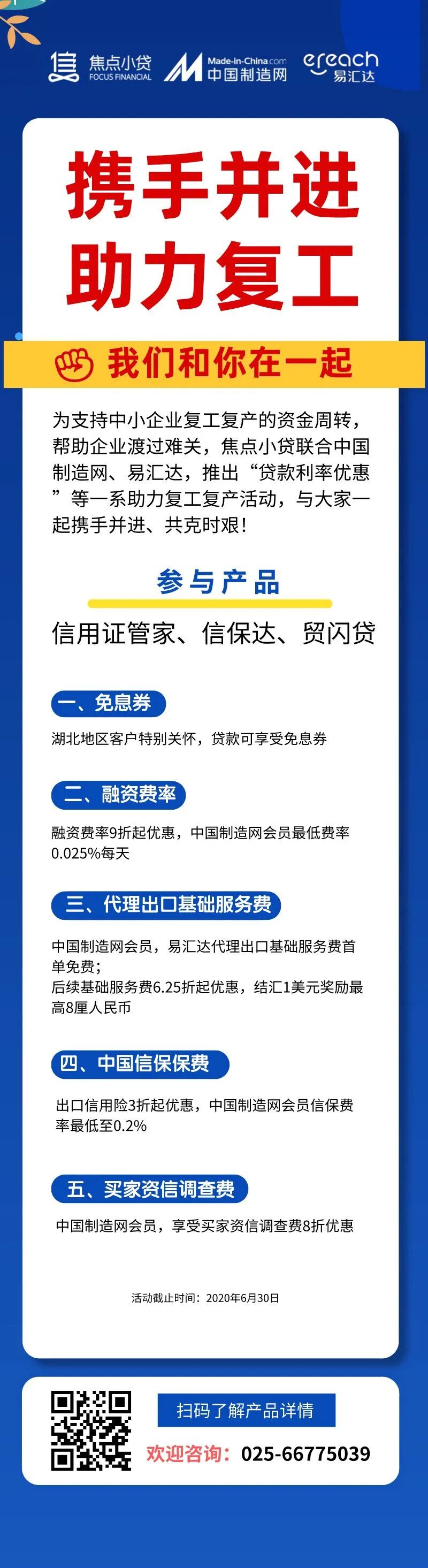 为支持中小企业复工复产的资金周转,帮助企业渡过难关,焦点小贷联合中国制造网、易汇达,推出“贷款利率优惠”、“出口信用险优惠”、“代理出口基础服务费减免”等一系列助力复工复产活动,与大家一起携手并进、共克时艰!