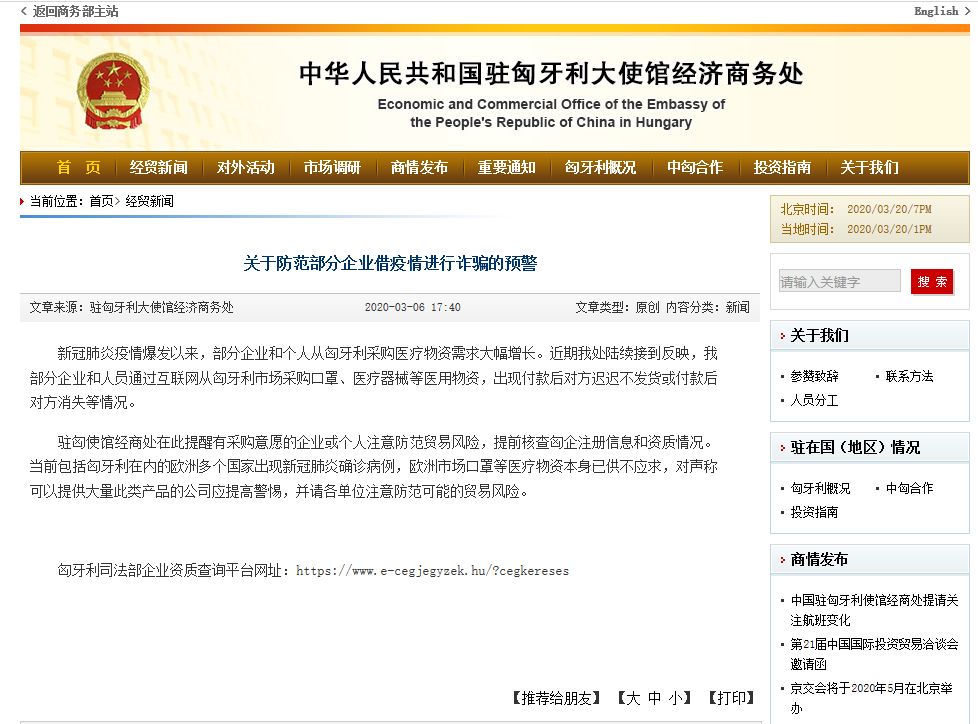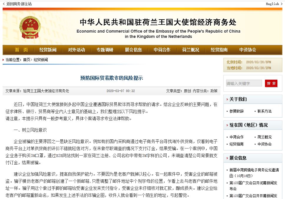 澳门企业遭遇的国际贸易欺诈并非个例,在各国疫情愈演愈烈的背景下,一些不法企业和个人也在借助疫情催生的各种需求,实施国际经贸欺诈。我国多个驻外大使馆经济商务处纷纷发布预警信息: